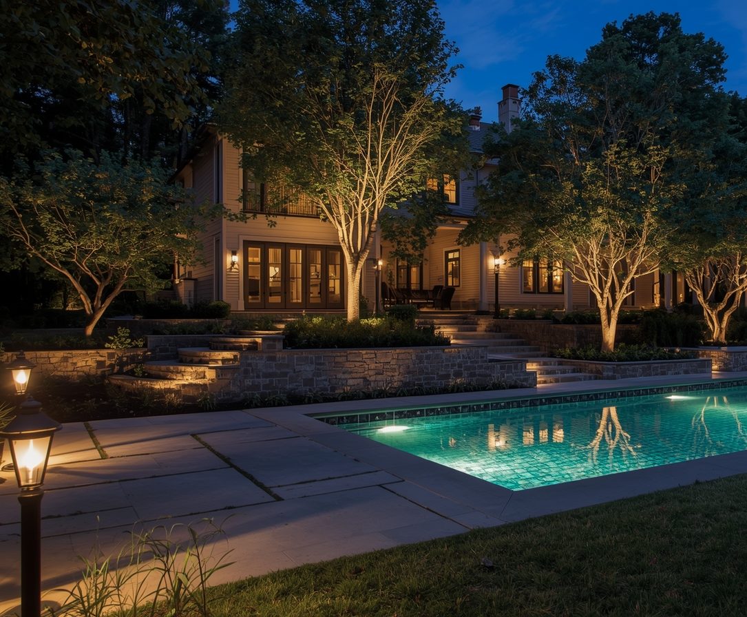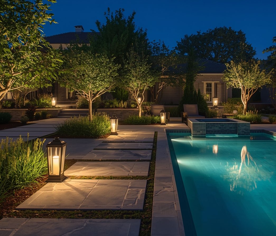 اجرای نورپردازی محوطه، مسیرها، باغچه، استخر، آبنما و آلاچیق